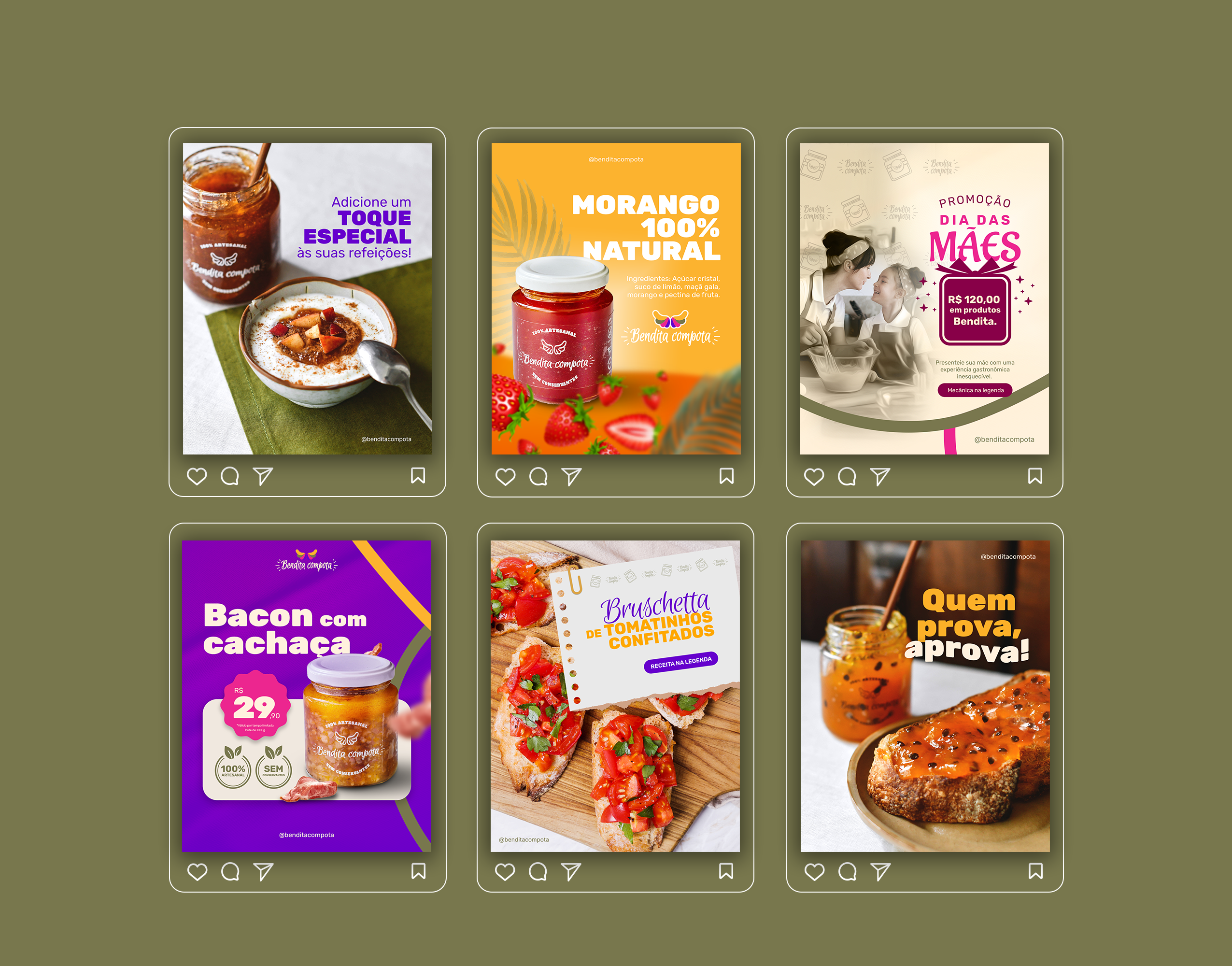 A Bendita Compota é uma empresa que desenvolve geleias e antepastos 100% naturais. A Criare Comunicação foi responsável por criar os conteúdos pertinentes as suas redes sociais, voltados para vendas, conforme orientação do responsável pela comunicação da empresa.